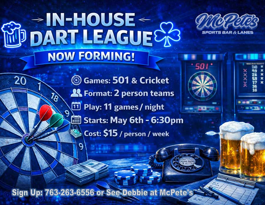 Step up to the throw line at McPete’s! Our dart leagues and tournaments offer friendly competition, great atmosphere, and plenty of good times. All skill levels welcome — from casual players to sharpshooters. Grab your darts and sign up today!